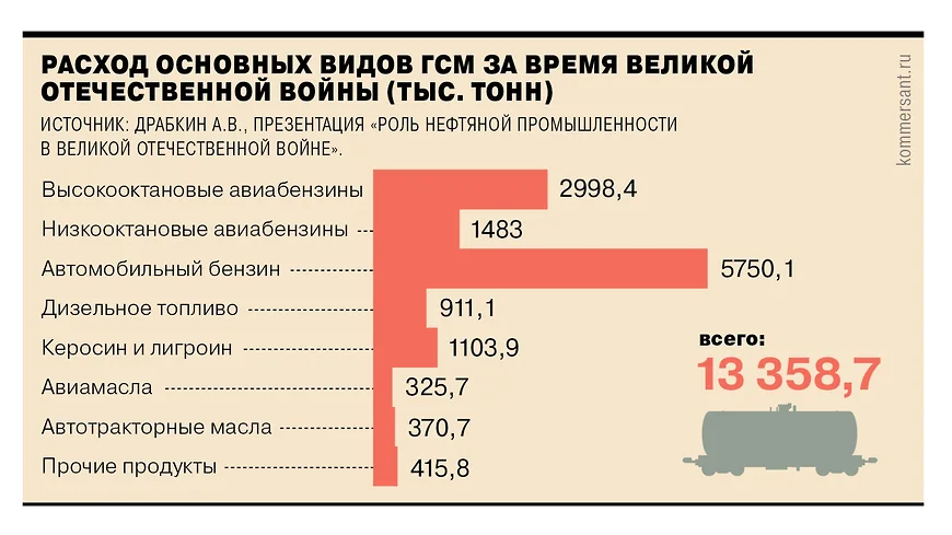 Промышленность обеспечила среднемесячный расход ГСМ вооруженными силами в 1944 году на 17,9% выше, чем в 1943-м, и на 44,5% выше, чем в 1942-м, а в январе—мае 1945 года он превысил уровень 1944-го еще на 19,2%.
